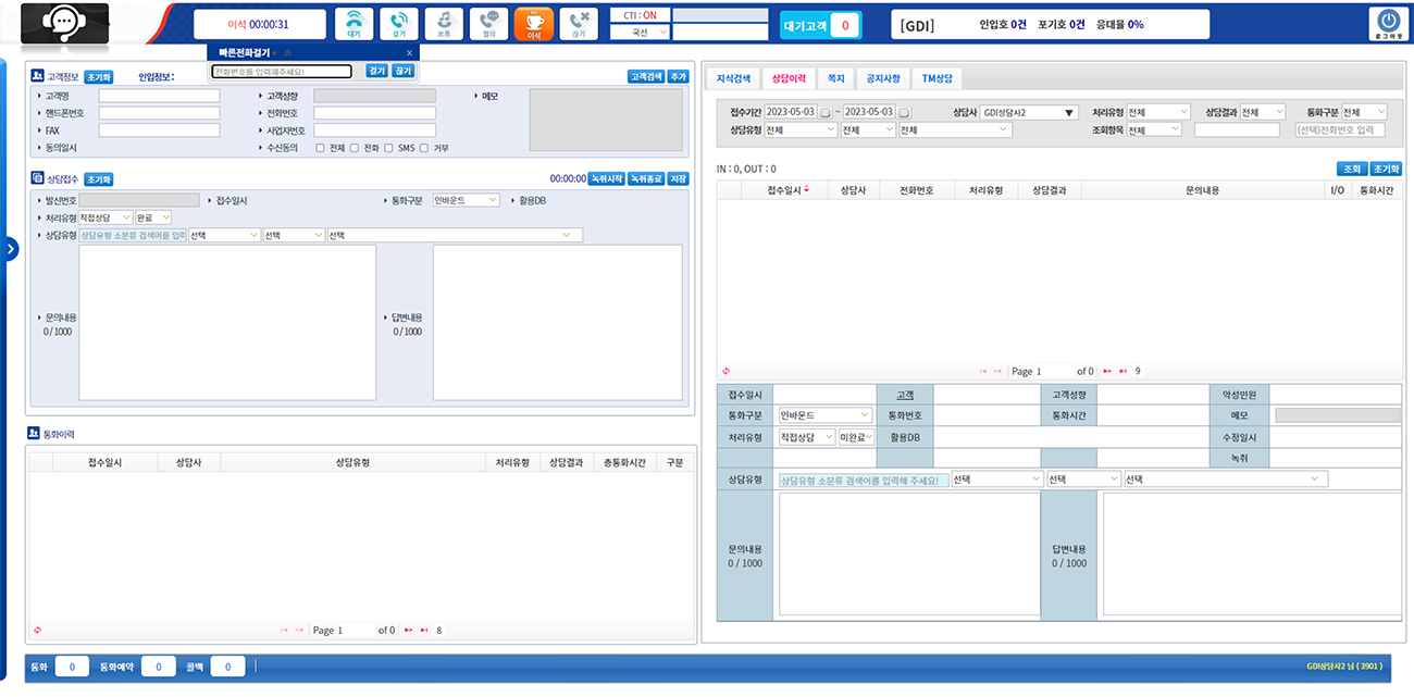 콜 보고서, 상담 보고서, 업무 보고서, 불만접수 보고서로 구성 CTI기능은 Inbound콜처리, Outbound콜처리, 고객정보 스크린 팝업, 3자 통화, 콜전환, 콜 모니터링, 콜 이력 관리, 콜 통계 분석으로 구성